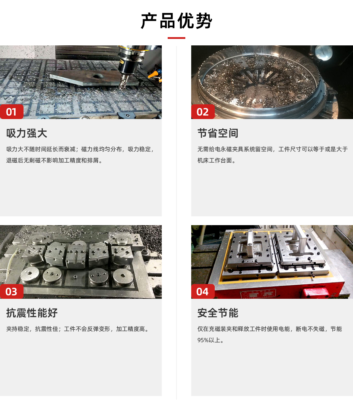 产品卖点:电永磁吸盘可产生高达16KG/c㎡的强大吸力;磁力线不会穿透被加工件表面,不会磁化刀具及机床主轴,不影响加工的精度和排屑。