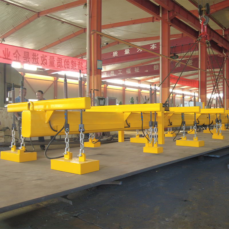 本系列产品专为吊运中厚板、宽厚板设计。考虑到长钢板吊运可能出现弯曲变形而影响安全吊运,在吊运这类钢板时,我们通常使用多台联吊。根据钢板的规格范围 ( 长、宽、厚 ) 及行车的起重能力,我们会选用不同规格的起重电永磁铁。