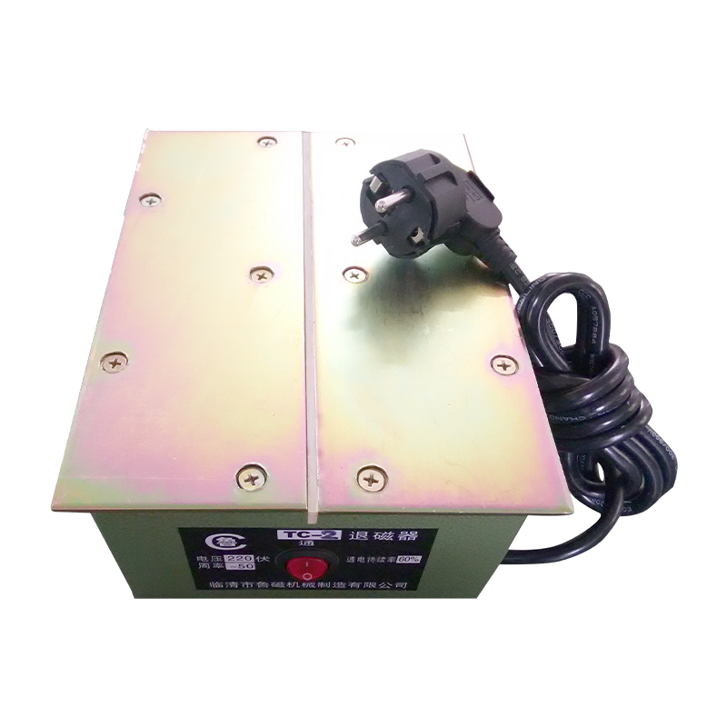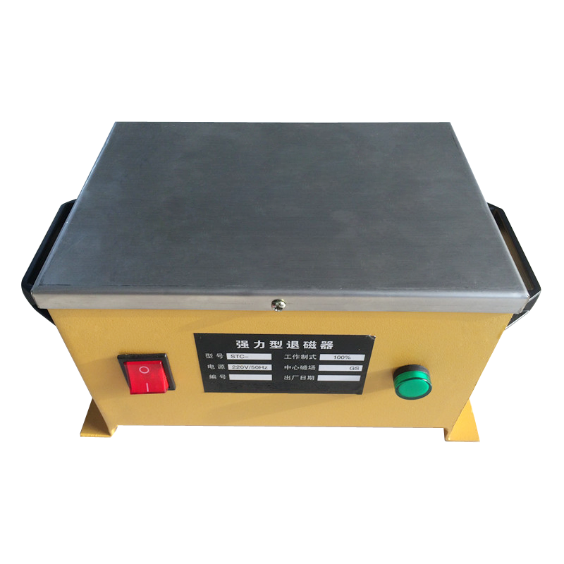 退磁器是用来消除因机械加工所产生的剩磁的一种设备,它由电磁线圈产生磁力线,直接或者间接的通过磁力线对原本工件的磁性进行干扰达到工件退磁。我国内主要退磁器有平台式退磁器,框式退磁器等。平台式退磁器主要是通过铁芯把线圈磁通导入到一个平面上对工件进行退磁。框式退磁器主要是在线圈内部穿过工件使磁力线切割工件剩磁达到退磁效果。退磁器需用交流电对线圈充磁。